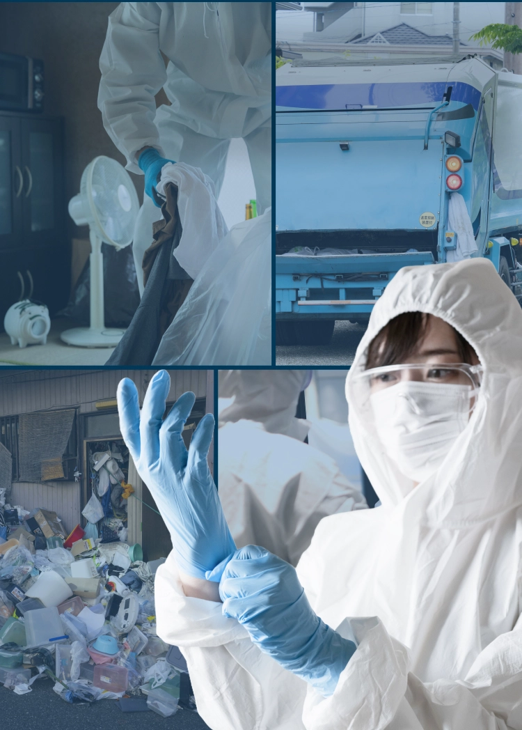 特殊清掃だけでなく、遺品整理、リフォーム、リノベーション、相続関連、不動産関連、そして法律関係に至るまで、幅広いサービスを提供しています。賃貸や臭いのトラブル、大家さんとのトラブルまで、どんな問題にもしっかりと対応し、ワンストップでサポートいたします。